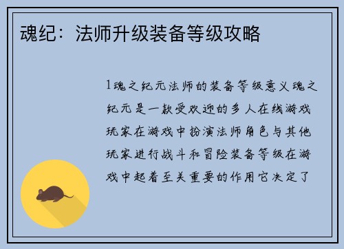 升级装备等级是魂之纪元法师提升实力的重要手段。通过合理选择装备、参与各种活动和任务,玩家可以快速提升装备等级,提高法师的战斗力和生存能力。在升级装备等级的过程中,玩家还需要注意合理分配装备属性、维护装备耐久度和及时升级装备,以保持法师的竞争力。希望本文对魂之纪元法师升级装备等级有所帮助,祝各位法师在游戏中取得更大的成就!